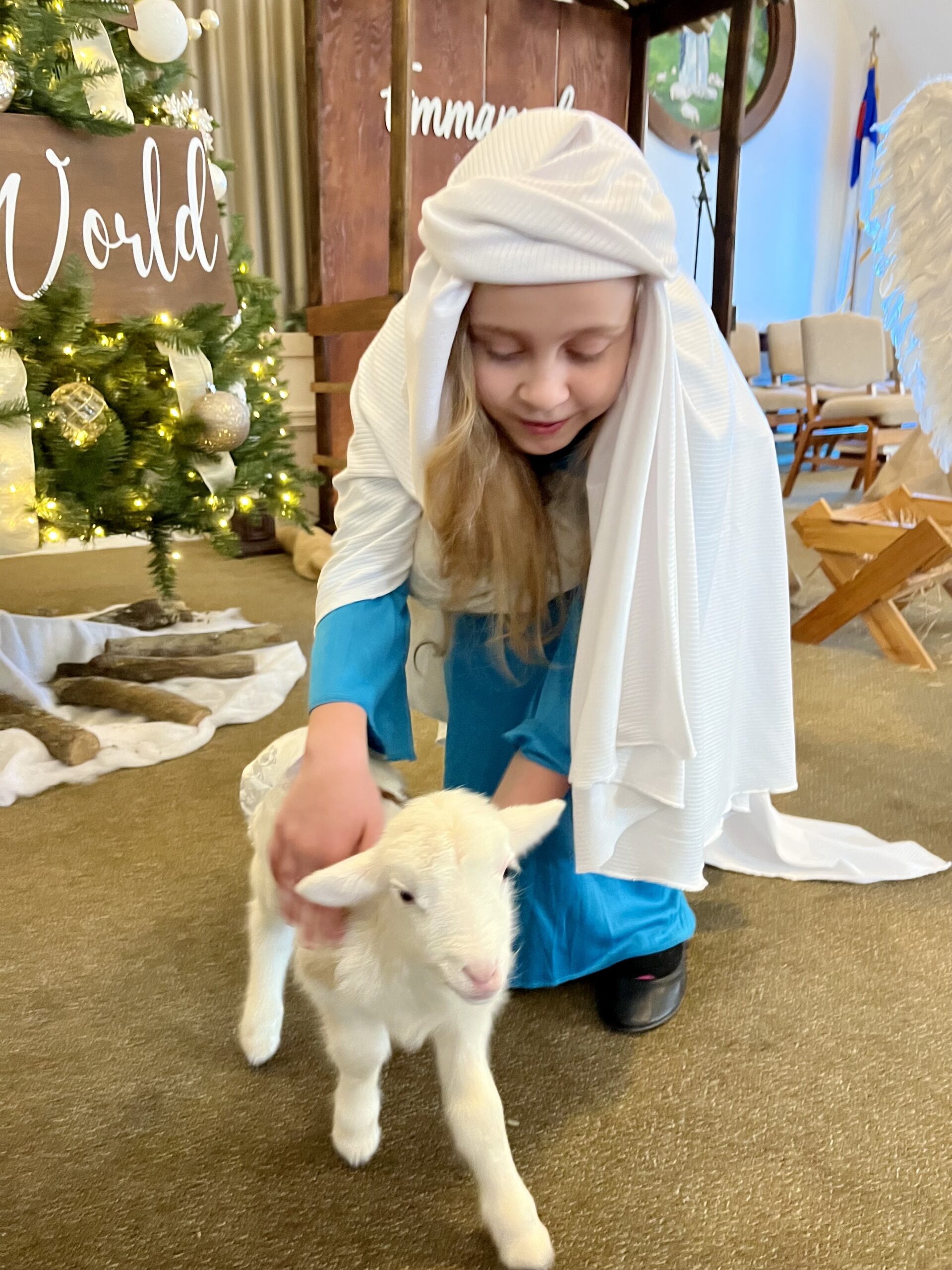 So cute! Matching cousins. Been busy on the farm, babies started coming last Monday, Belle got left by her mom, but Jingles her brother is doing well and now bigger than his indoor sister. Twins this morning, two singles this Monday and another lamb Sunday. Absolutely beautiful weather for December 24th, sitting in the deck untroubled to hay. Ashley and Yrevor here with all the grand dogs, Lacey spent the night also. Doing our Christmas today, have sausage and biscuits casserole and a peach biscuit bread pudding in the oven. Lots more food planned for later. Enjoy the peace right now as all get dressed and ready to enjoy the day. Merry Christmas to all! Here is Belle with Mary from our cantata Sunday.