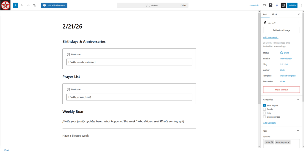 The template will autofill most information, including birthdays and anniversaries over the next 14 days, any active prayer requests, a random holiday, and the post category and tags.
