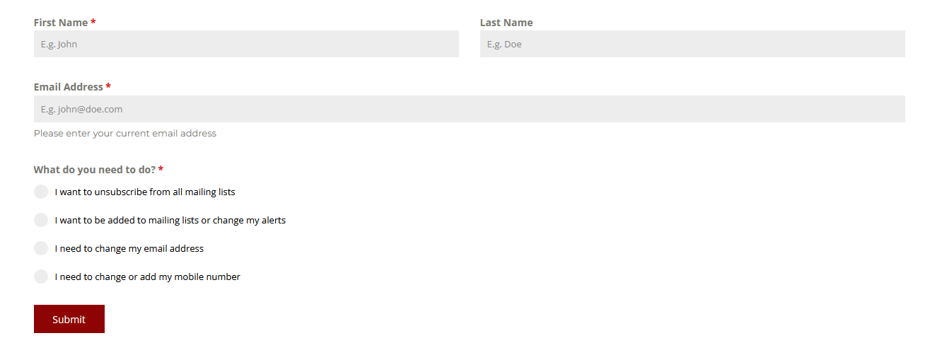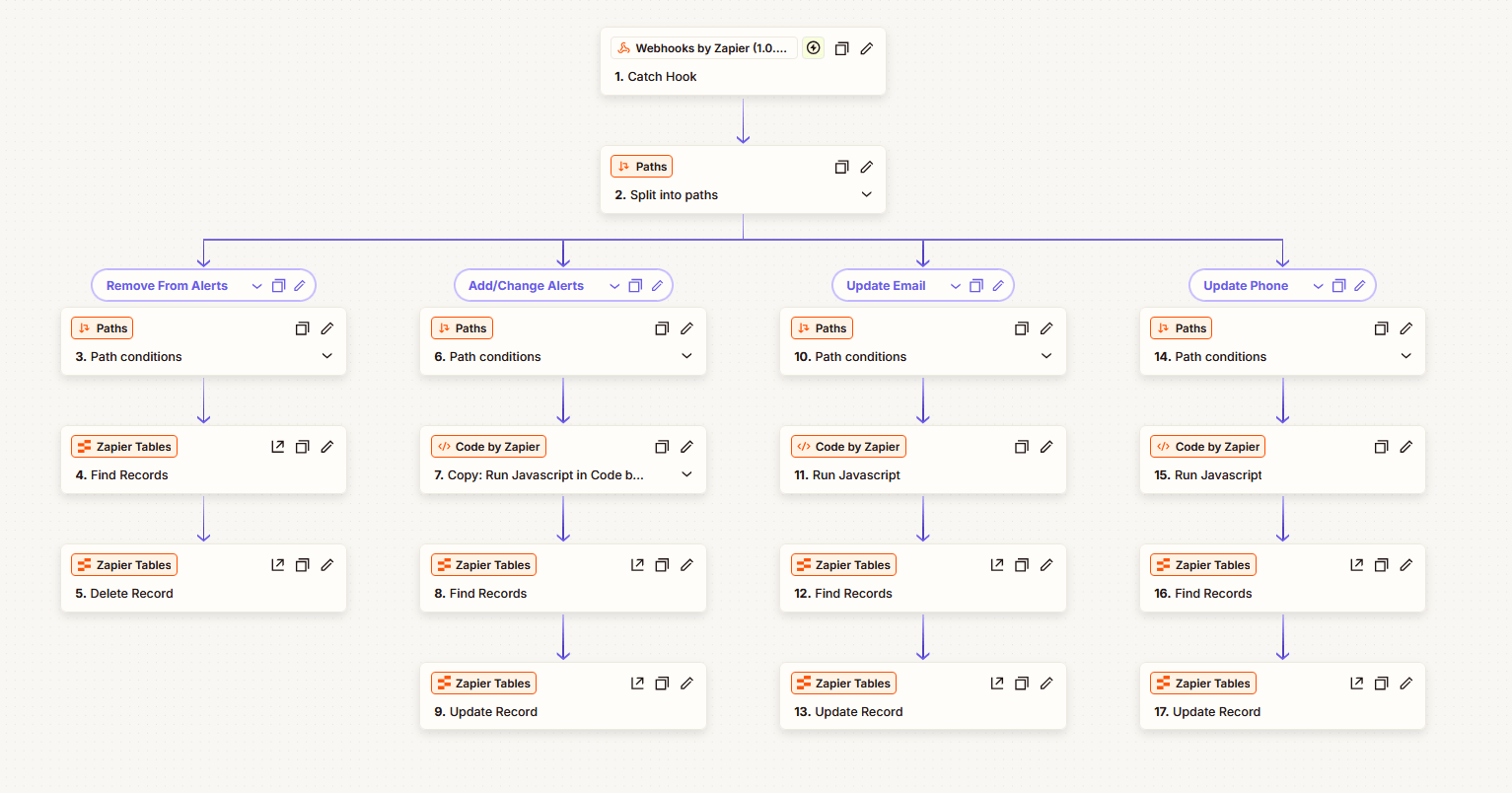 Zapier handles all email updates through the update form (either accessed from the footer or through your profile tabs). Once submitted, you should be immediately added or removed from selected emails/notifications. Note that this does not update your site account email (that’s on purpose). Note that an SMS option is included; this is TBA for now and may be implemented sometime in the future, but only if the user has SMS notifications checked in the table.