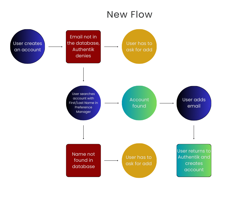 Now, if Authentik denies your account because you don’t have an email in the database, you can go back to the preference manager to add your email. Search by name and the preference manager queries the database to return possible matches. If more than one match returns, select the best match. You’ll validate your information (birthday and zip that is currently in the table), and then enter an email address. At that point, you can attempt account creation again and Authentik should approve since the email exists.