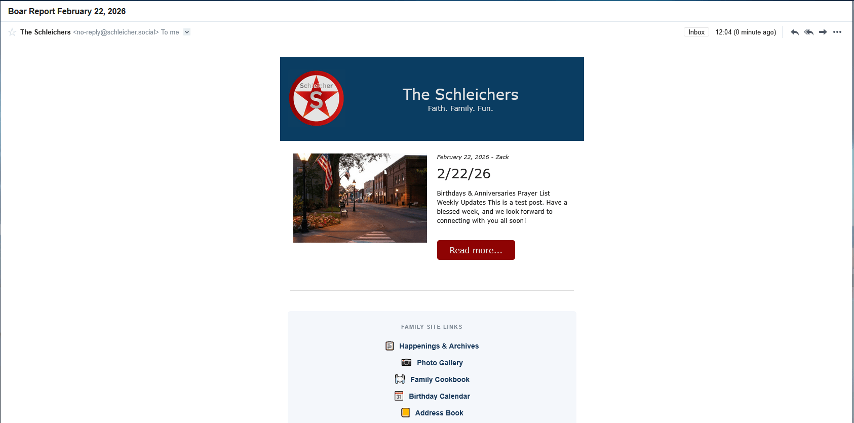 Once sent, it’ll send the latest Boar out! Done! Literally can be done in 2 minutes (or less). It does not include anything more than a link back to the post, since ideally all commenting/discussion is done on the post. Replies go back to the central email (and when time permits…maybe can be added onto the end of the post).