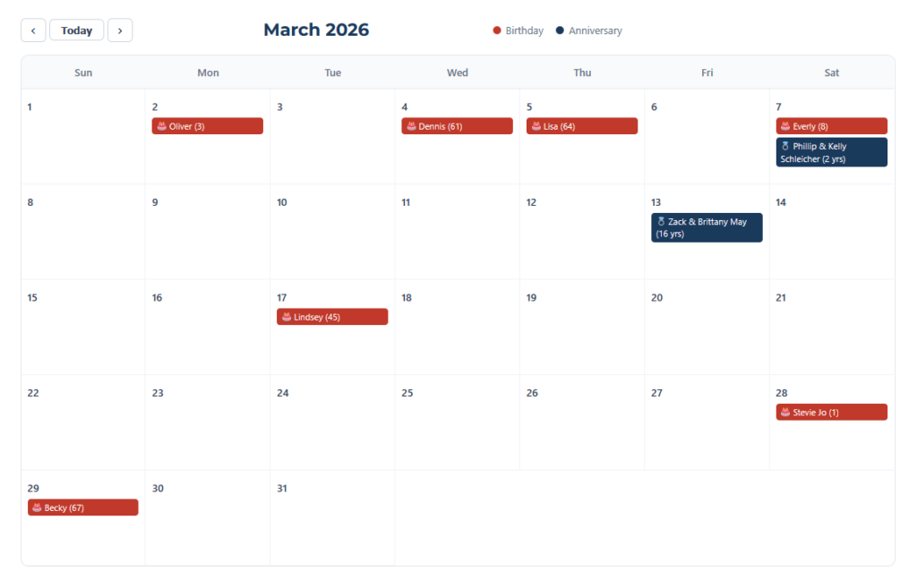 So, to elaborate a bit on the new birthday and anniversary feature, we built a widget to inject upcoming birthdays and anniversaries directly into a page/post.
