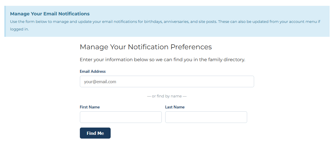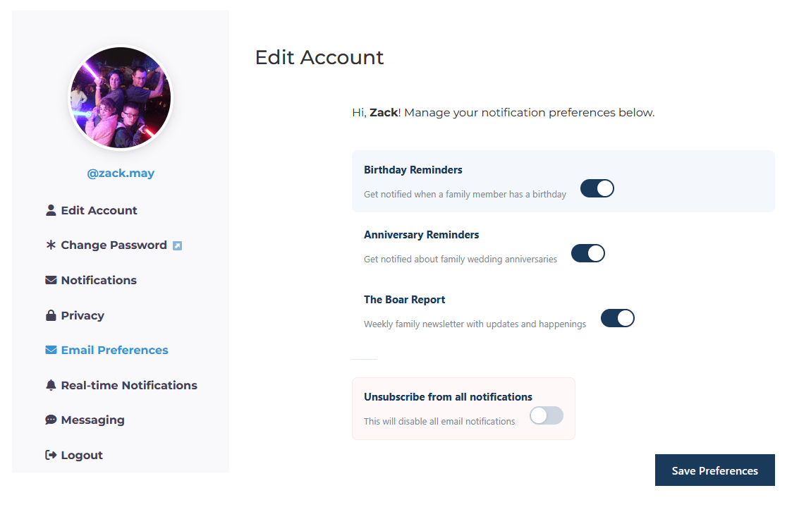 And that leads to the next really big background update. Still in the preference manager, but addressing a pain point. Previously, if you did not have an email in the family database, you could not register for the site or for Schleicher Social without asking someone that had an account to add you into the database. Addressing that chicken-before-the egg problem, if you don’t have an email, you can add it yourself without waiting for someone else to update it.