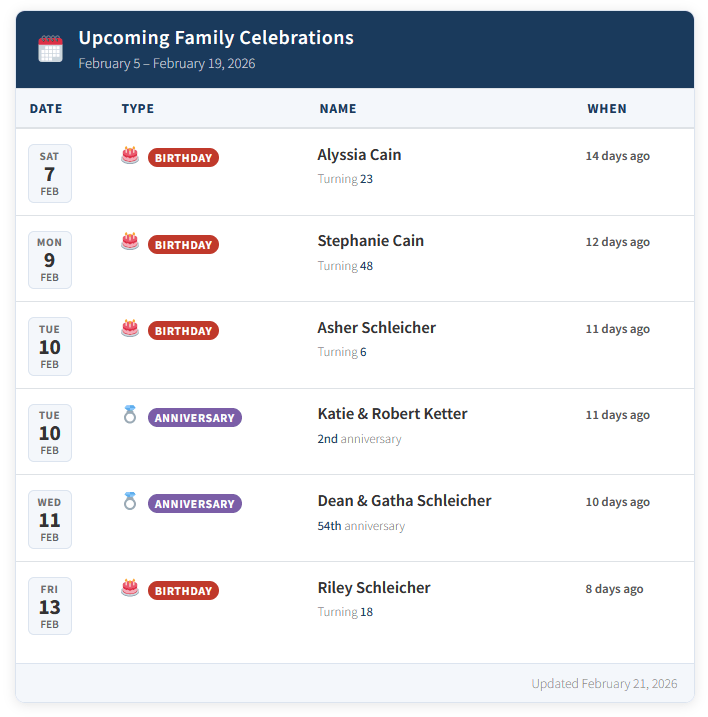 Second is to start consolidating down the email notification update form as well as eventually move away from Google calendar completely for birthday and anniversary push updates. Right now changes made in the family database push to Google at 8am every morning, which is then read by Zapier to send out push emails and publish the Mastodon posts; it introduces another point of failure and, given the recent track record of compromised accounts with some of the large providers, I’d rather remove a point of interception.
