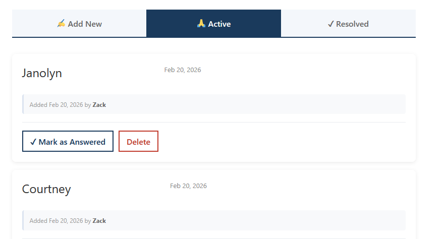 Requests can be worked with from the profile menu when logged in. Go to My Account→Profile→Prayer Requests.