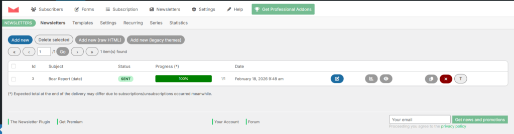 Newsletter works off the Boar Report subscription list. Right now, nobody is on that list that doesn’t manually request it. It works like any other newsletter, though, and once sent it’ll go to everybody on the selected list. Start by opening the “Newsletter” option from the Newsletter icon in the admin dashboard.