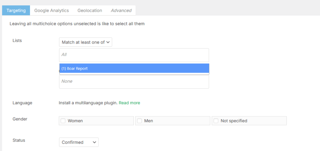 The important part here is to select the Boar Report list. Don’t worry about anything else; I don’t track location, and the site isn’t indexed so I don’t care about Google Analytics. Leave everything else as-is. Hit “Send”. You’ll get a notice that the program will start batch emailing; it will send emails in batches of 100 every 5 minutes (note you can also schedule it to send later).